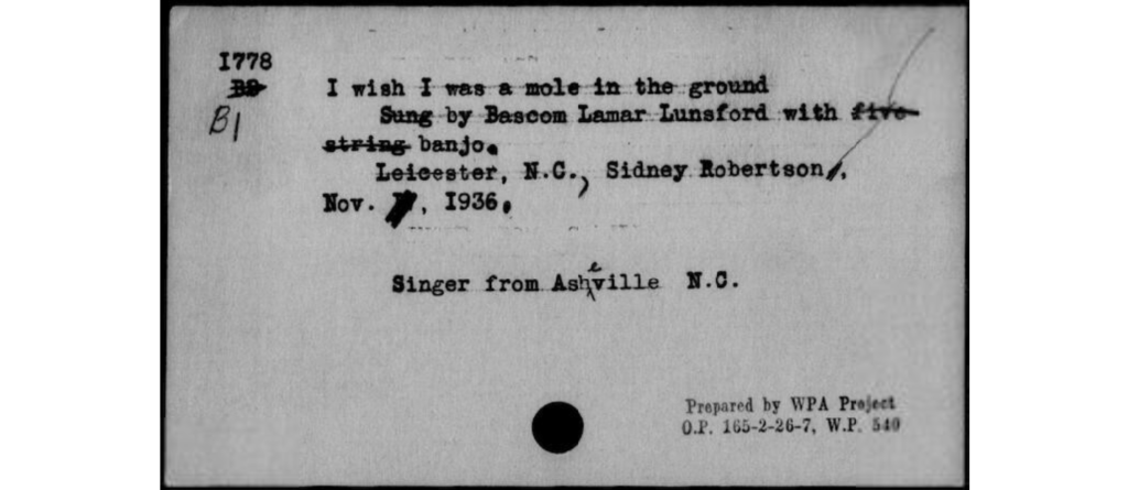 Bascom Lamar Lundsford recorded the version included in the Anthology. Although Lundsford was from a rural area like many of the performers on the collection, he was an educated man, eventually graduating from law school. Lundsford was an accomplished fiddler, and when he was employed as a traveling fruit tree salesman used the opportunity to collect folk songs from the people he met on his travels.